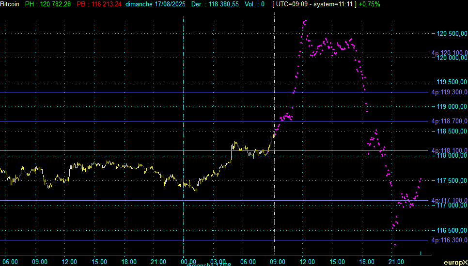 Bitcoin 17 août 2025 Antoine Zaccaria A la une, Cryptos, Général 0 Prospective du 17/08/2025 – Unité de temps = 5 min Prospective pour la journée de dimanche 17 août 2025 1 2 3