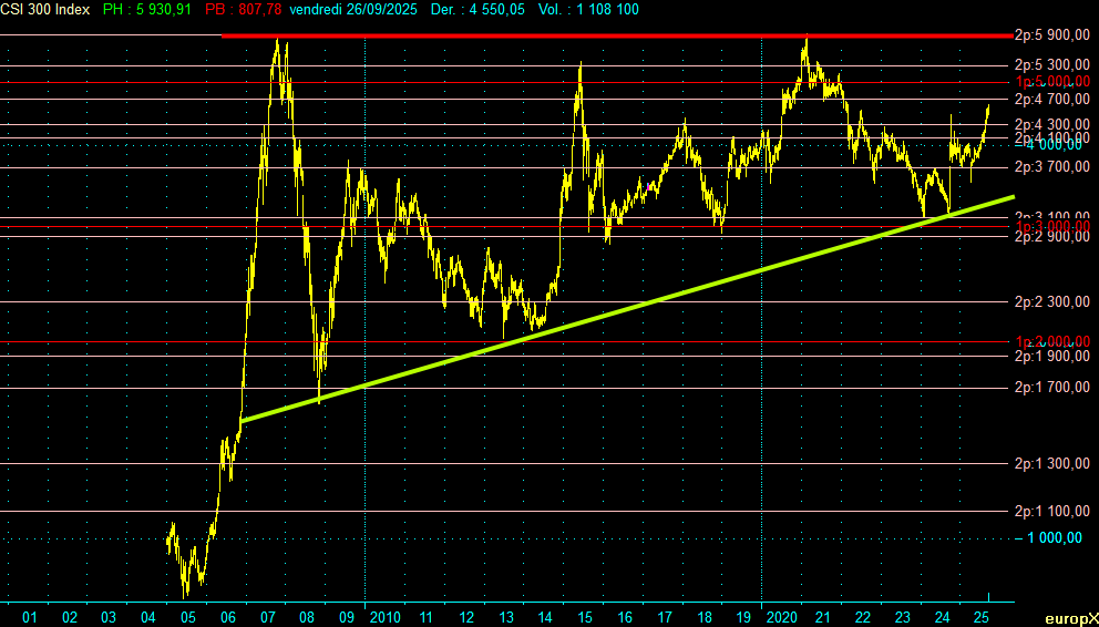 L’indice CSI 300, baromètre des 300 plus grandes capitalisations boursières chinoises cotées à Shanghai et Shenzhen, offre une lecture très intéressante de l’évolution du marché actions chinois sur les deux dernières décennies. Cette analyse technique et macroéconomique révèle une configuration remarquable : après 20 ans d’oscillations entre des niveaux bien définis, l’indice pourrait se préparer à franchir un plafond historique dans les deux années à venir.