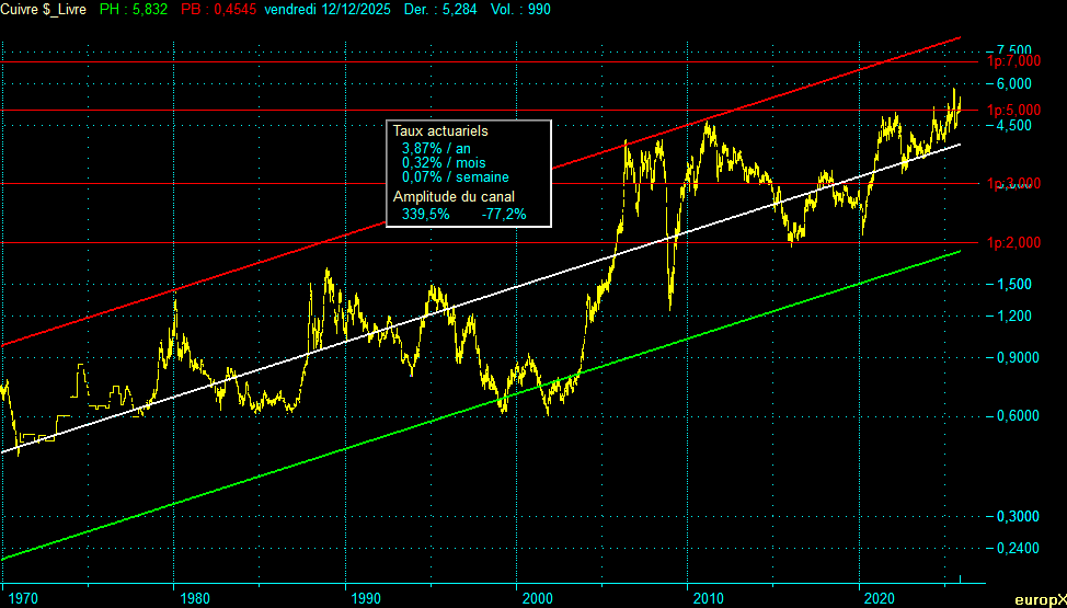 Le canal historique de 55 ans, délimité par trois droites parallèles sur échelle logarithmique, a encadré l’intégralité des cycles du cuivre avec une précision remarquable :