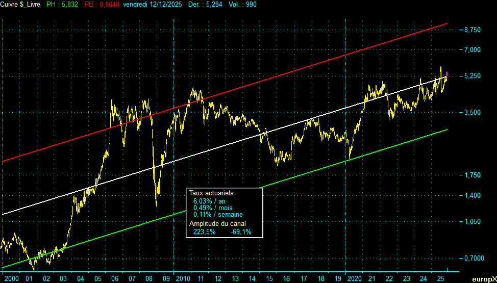 C’est le scénario « Goldilocks » : ni trop chaud, ni trop froid. Le cuivre suit tranquillement la pente du canal court terme (+6%/an).