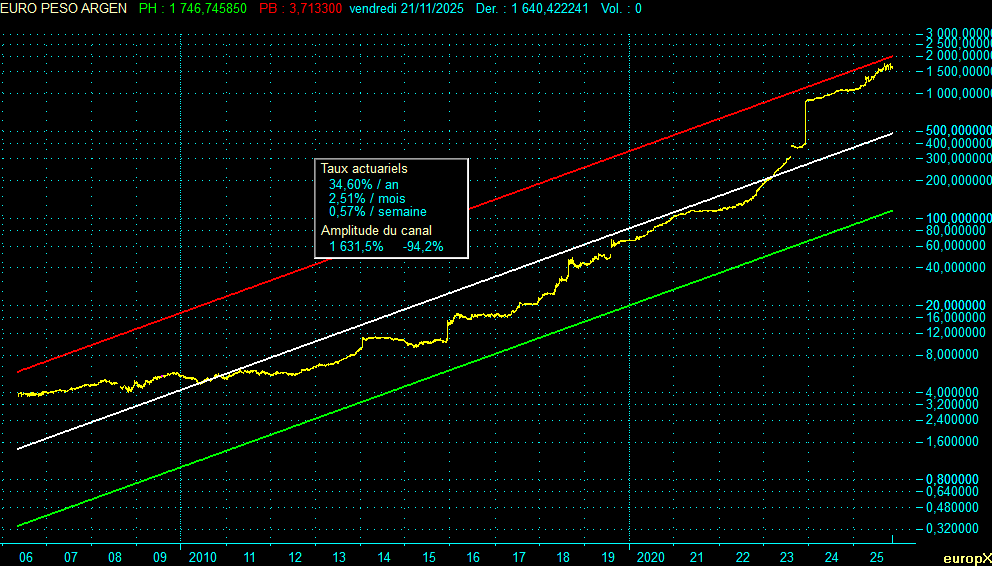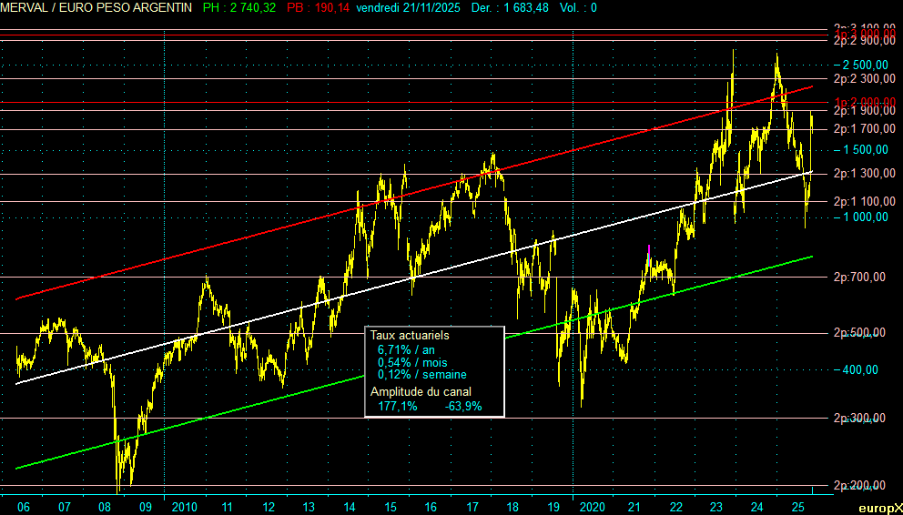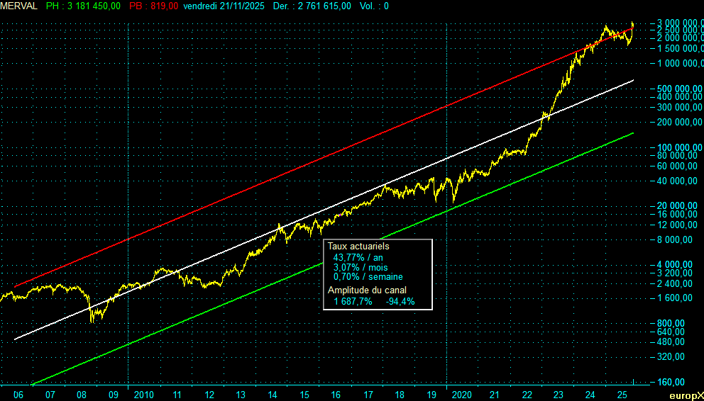 Analyse réalisée sur la base des données hebdomadaires du MERVAL de juin 2007 à novembre 2025, et du taux de change EUR/ARS. Les performances passées ne préjugent pas des performances futures. Cette analyse technique et macro ne constitue pas un conseil en investissement.
