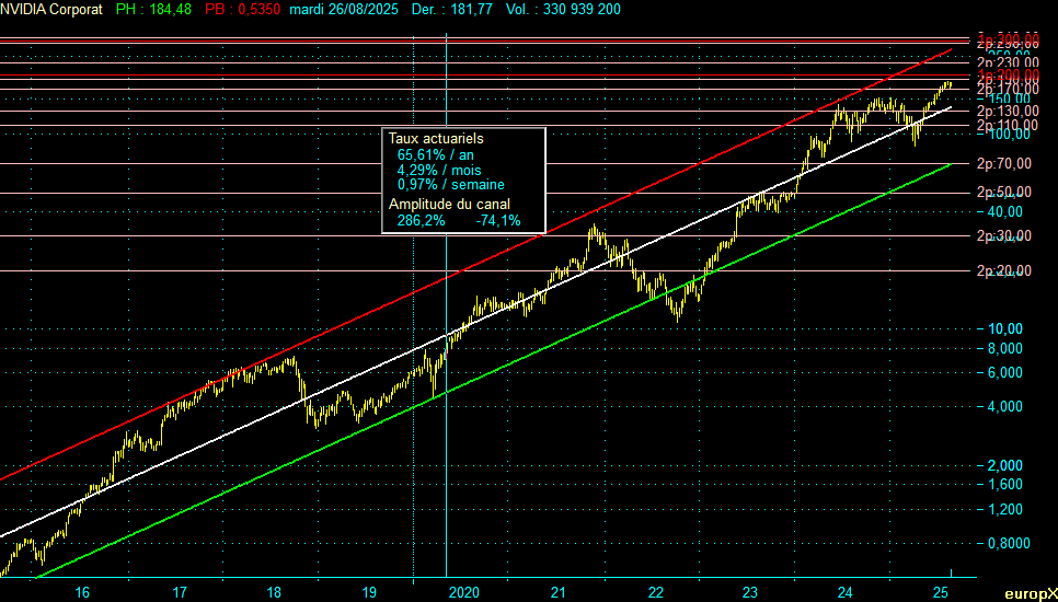 Amplitudes explosives : Chaque phase haussière génère des gains supérieurs à 1000%, témoignant de la capacité de NVIDIA à surfer sur les vagues d’innovation technologique.