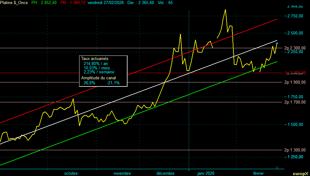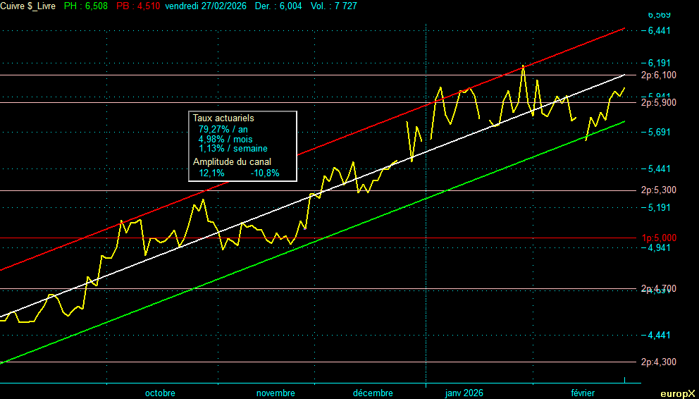 Lecture : L’or évolue en zone haute de canal (entre médiane et résistance), légèrement en retrait du record de 5 595 $ du 29 janvier. L’argent, le platine et le cuivre se trouvent tous les trois en zone basse-médiane, encore en phase de digestion après le krach du 30 janvier.