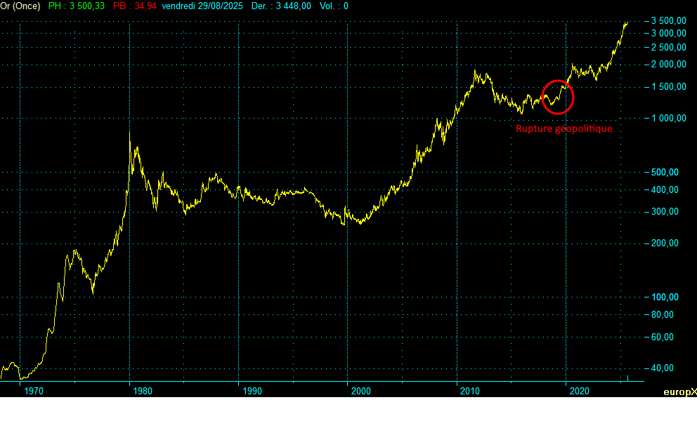 Enfin, la géopolitique : guerre froide, chocs pétroliers, révolution iranienne. L’or capte toutes les primes de risque d’un monde devenu imprévisible.