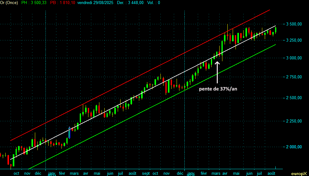 Depuis octobre 2023, l’or affiche une pente progressant à 37%/an, passant de 1810$ à 3500$ en 23 mois. Cette performance place 2024 parmi les meilleures années de l’histoire du métal jaune, comparable seulement aux explosions de 1979-1980 ou 2005-2008.