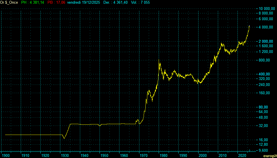 Graphique 3 : Once d’or en dollars (1901-2025) — Échelle logarithmique