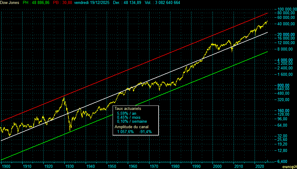 Canal logarithmique du Dow Jones. Taux actuariel : 5,59 %/an. Amplitude du canal : 1 057,6 %. Position actuelle (48 135) : au-dessus de la médiane, proche du haut du canal.